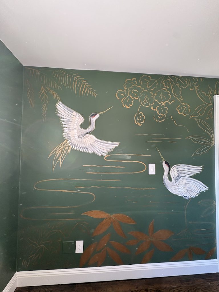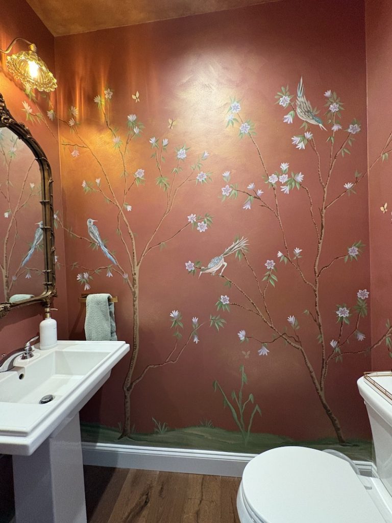 Chinoiserie murals encompass intricate patterns and delicate oriental motifs often including gold and silver gilding. Arlene’s chinoiserie mural designs are all hand painted with lovely florals, birds and butterflies.